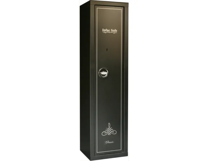Armero de seguridad homologado con la nueva normativa UNE EN 1143/1:2019 con capacidad para 6 armas largas (rifles). Cuenta con estante o balda para tener nuestra munición o accesorios ordenados y a mano., diseñada con una ranura para armas extra largas.